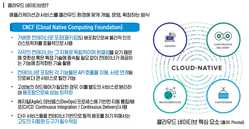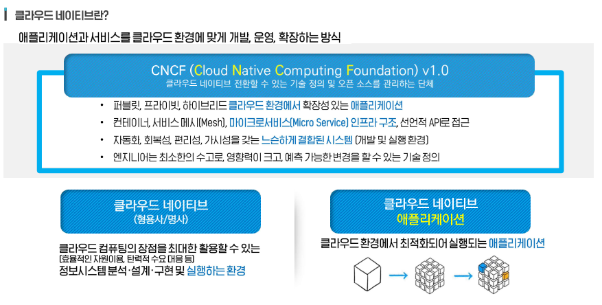 클라우드 네이티브 컴퓨팅 재단(CNCF: Cloud Native Computing Foundation)에 의하면 ‘최신 애플리케이션’으로 불리는 클라우드 네이티브 애플리케이션은 공통적으로