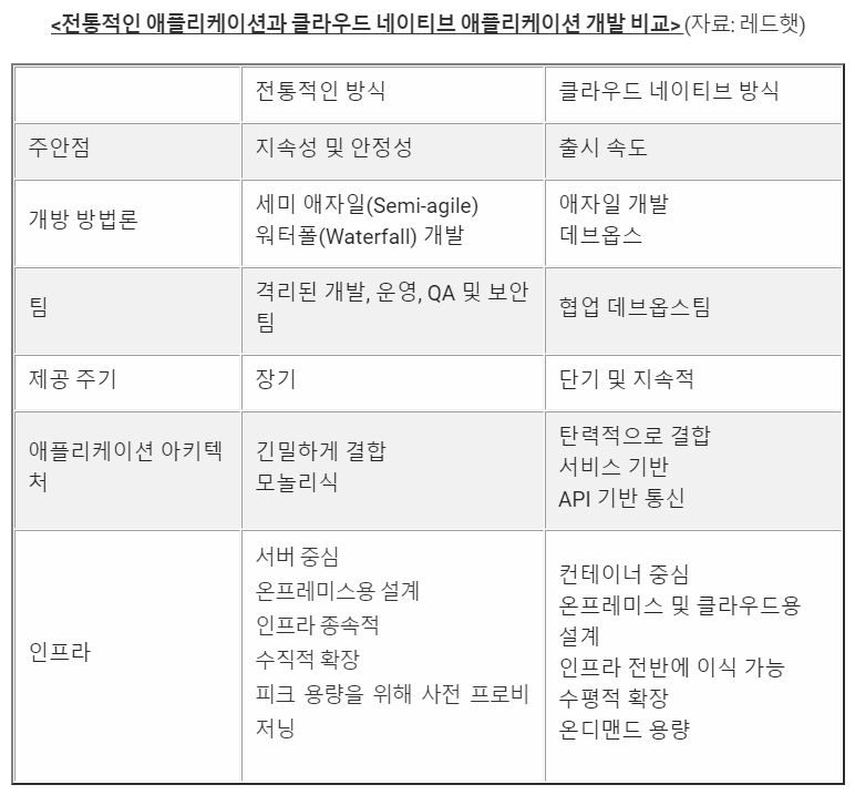 <전통적인 애플리케이션과 클라우드 네이티브 애플리케이션 개발 비교> (자료: 레드햇)