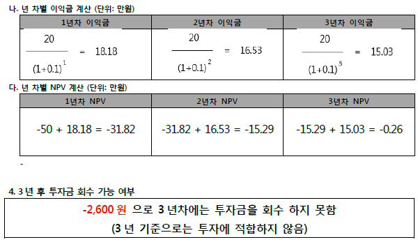 - 단점 : 현금흐름의 시간가치와 회수기간 이후 현금흐름 무시