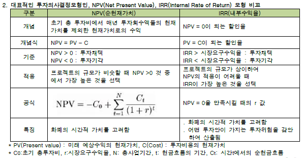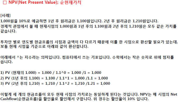 - 같은 조건이라면 NPV가 클수록 좋으며 최소한 0보다 높아야 이익