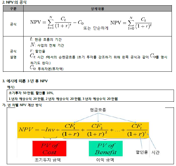 - 미래의 현금흐름(cash flow)을 현재의 기준으로 환산한 수익과 투자금액의 차이