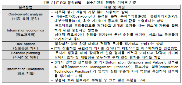 - 투자비용 : 컨설팅 비용 + 구축비용 + 유지보수 비용 등