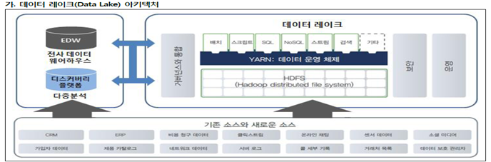 이를 위해 등장한 개념이 ‘데이터 레이크’다. 데이터 레이크는 데이터의 종류를 묻지도 따지지도 말고 저장하는 공간을 말한다. 기업에서 발생하는 데이터를 모아서 한 곳에 저장해두자는 접근법은 DW와 같지만, 대상으로 하는 데이터의 종류가 다르다. DW는 구조적 정형 데이터가 대상이지만, 데이터 레이크는 모든 데이터가 대상이다.