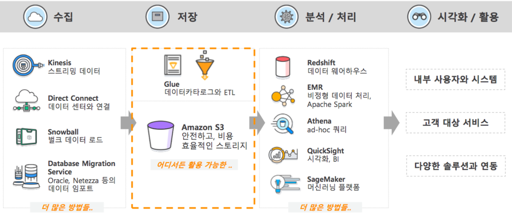 이뿐 아니라 하둡과 같은 비정형 데이터를 분석할 때는 EMR(Elastic MapReduce)이라는 서비스를 이용하면 되고, ad-hoc 쿼리는 안테나라는 서비스로 처리할 수 있다. 퀵사이트(QuickSight)라는 시각화 툴, 세이지메이커(SageMaker)라는 머신러닝 플랫폼으로도 분석할 수 있다.