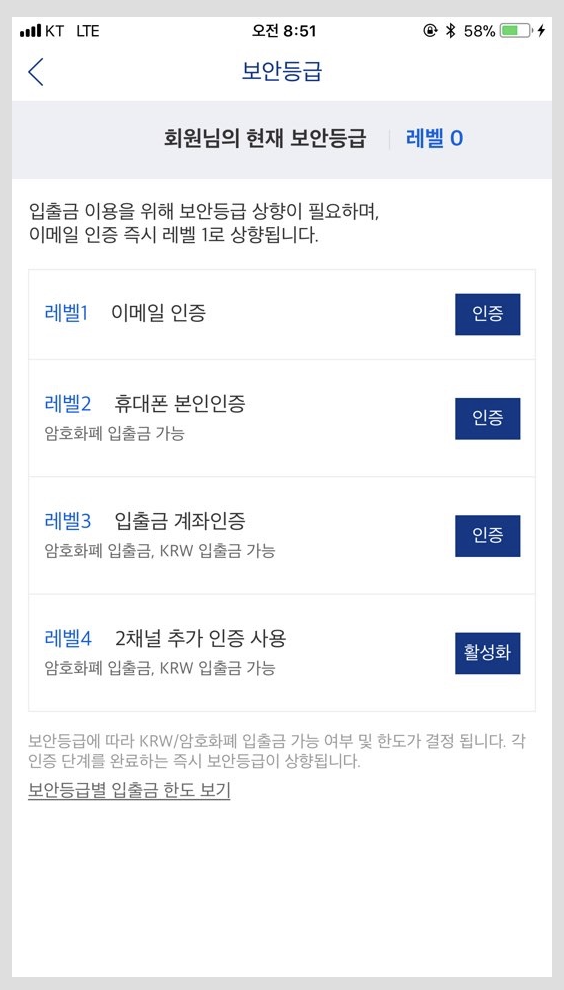 - 업비트 거래소 어플의 보안등급 설정 화면