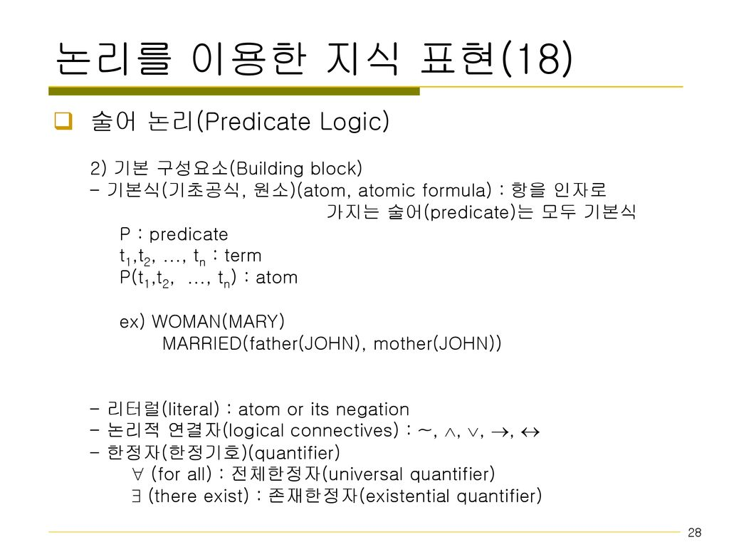 * 술어: 원자 (atomic) 문장, 참/거짓의 값을 가짐