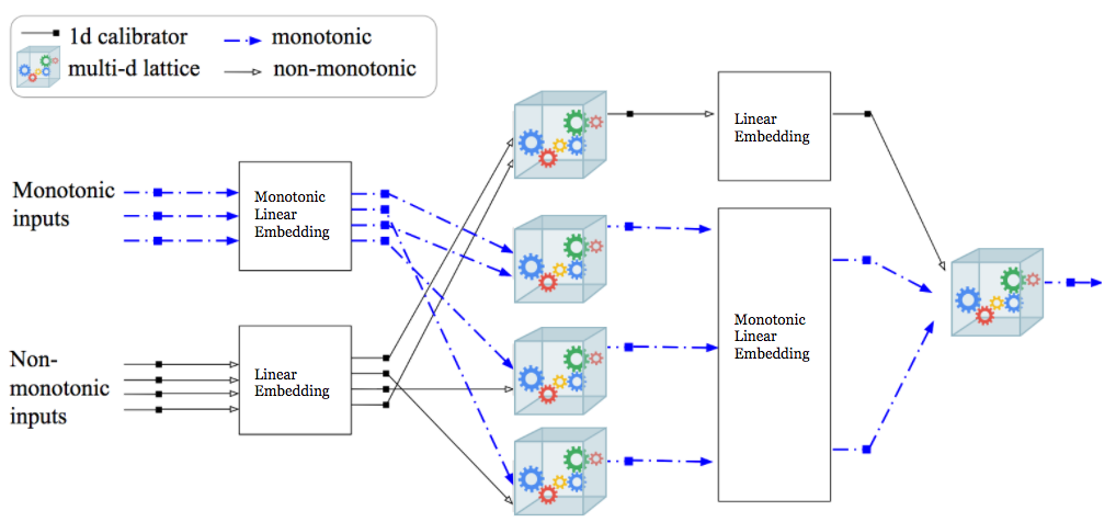 보정자 계층(신경망에서 ReLU의 합과 같이 동작함)을 사용하여 격자 앙상블 및 선형 임베딩 계층을 교대로 사용하는 9계층 심도 격자 네트워크 아키텍처[5]의 예입니다. 파란색 선은 단조 입력에 해당하며, 계층별로 유지되므로 이런 식으로 전체 모델에 대해 유지됩니다. 계층마다 구분이 가능하므로 TensorFlow Lattice를 사용하여 이 아키텍처는 물론, 임의의 다른 아키텍처도 구성할 수 있습니다.