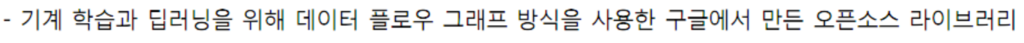 - 구글이 개발한 기계 학습과 딥러닝을 위해 데이터 플로우 그래프(Data Flow Graph) 방식을 이용해 만든 오픈소스 라이브러리