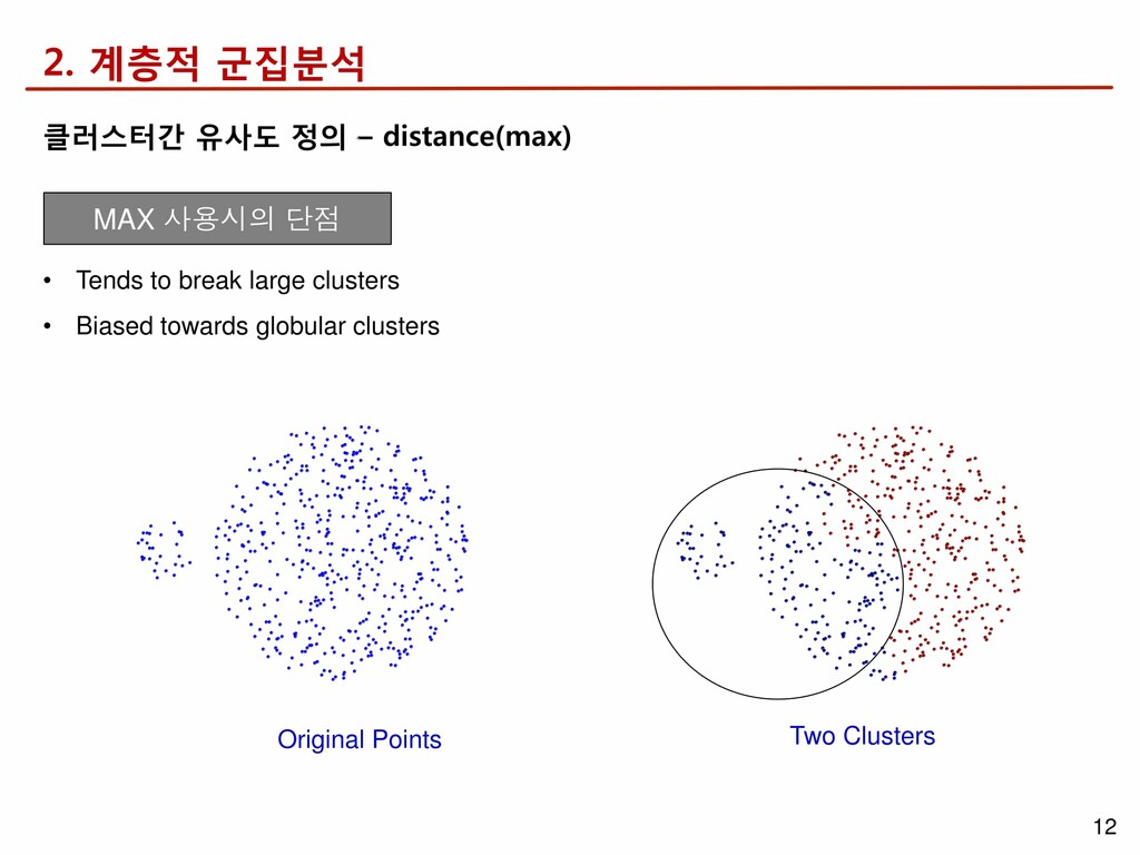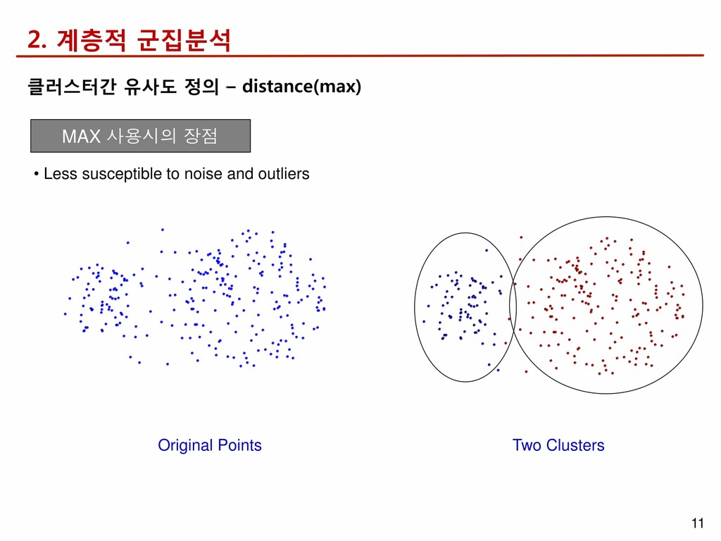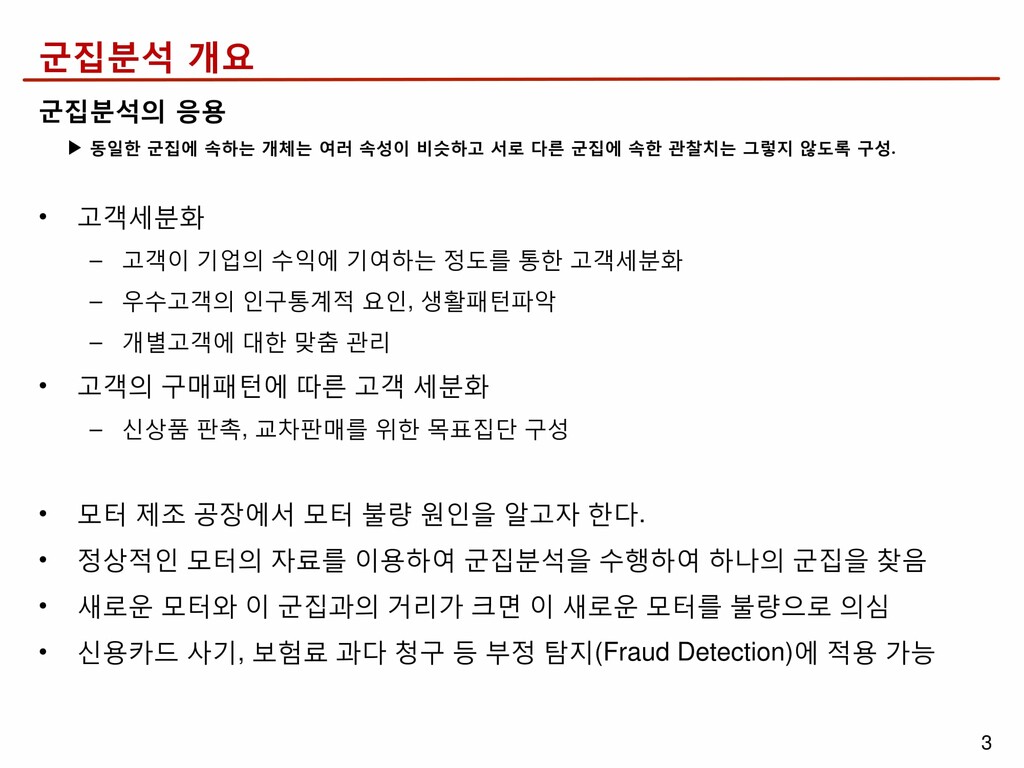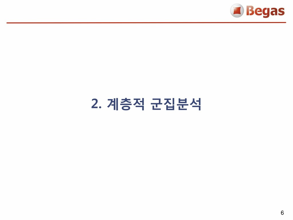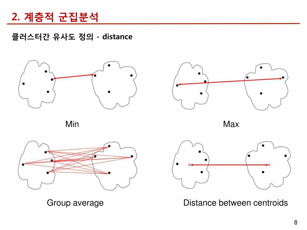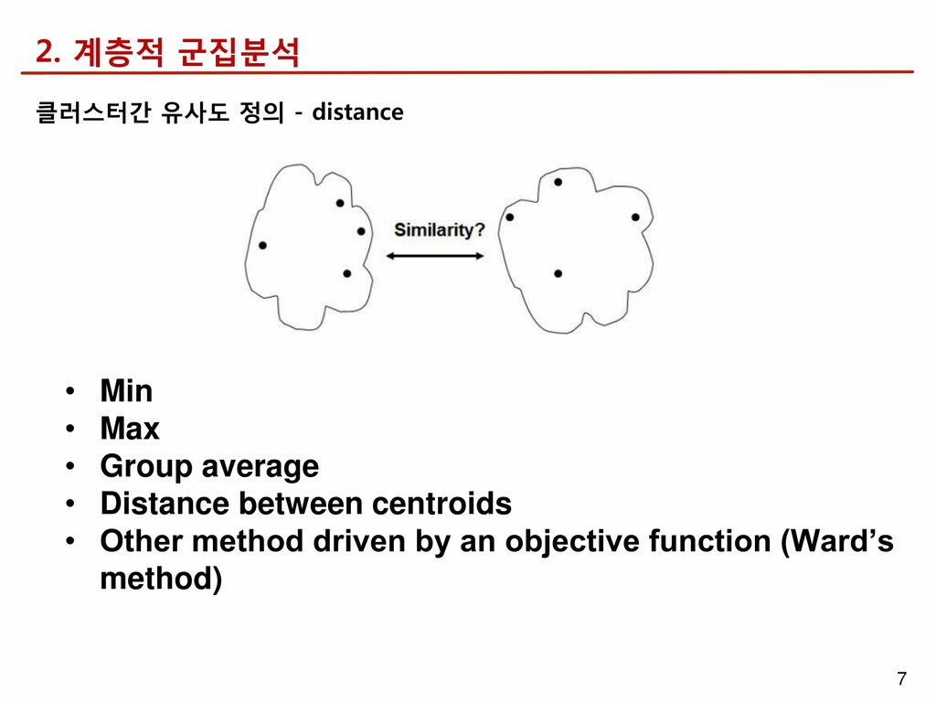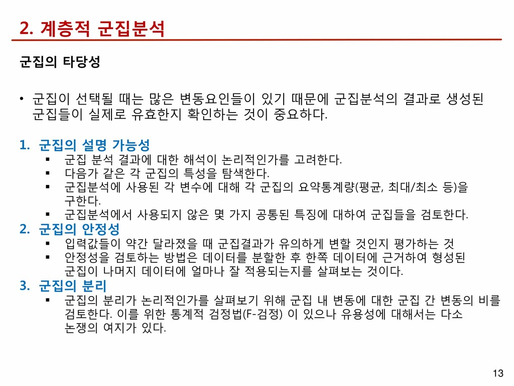 - 따라서 군집의 수를 변화시켜 가면서 수행된 결과들을 비교해가는 분석방법이 요구(F-검정법등)