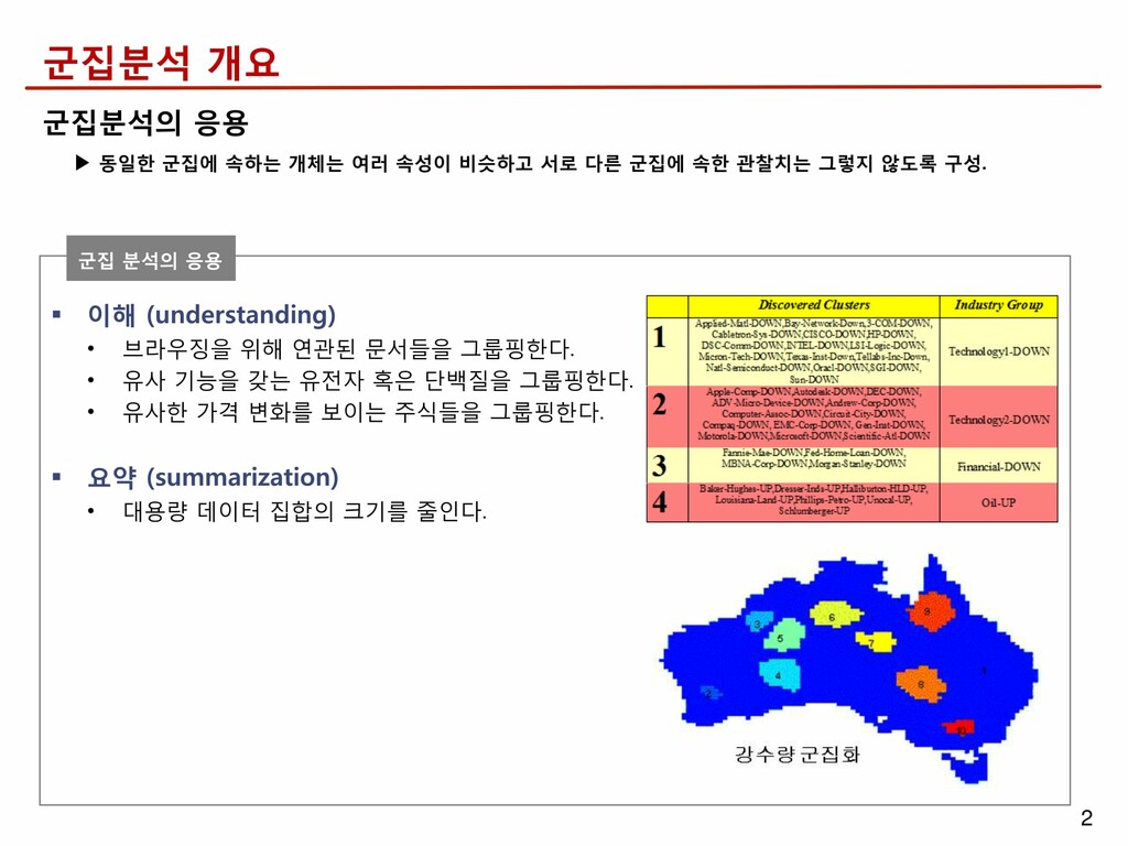 - 대상들을 분류하기 위한 명확한 기준이 존재하지 않거나 기준이 밝혀지지 않은 상태에서 다양한 특성을 지는 대상자들을 집단으로 분류하는데 사용하는 기법