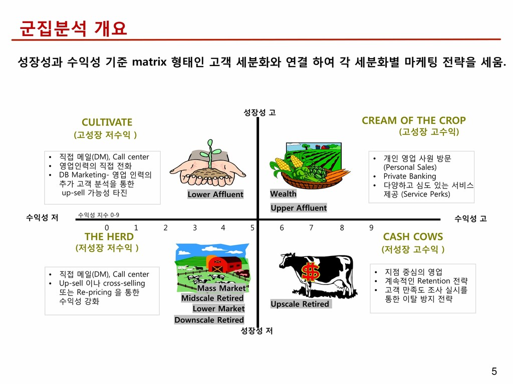 - 대상을 군집(Cluster)이라 불리는 상대적으로 동질적인 집단으로 분류하는데 이용되는 기법