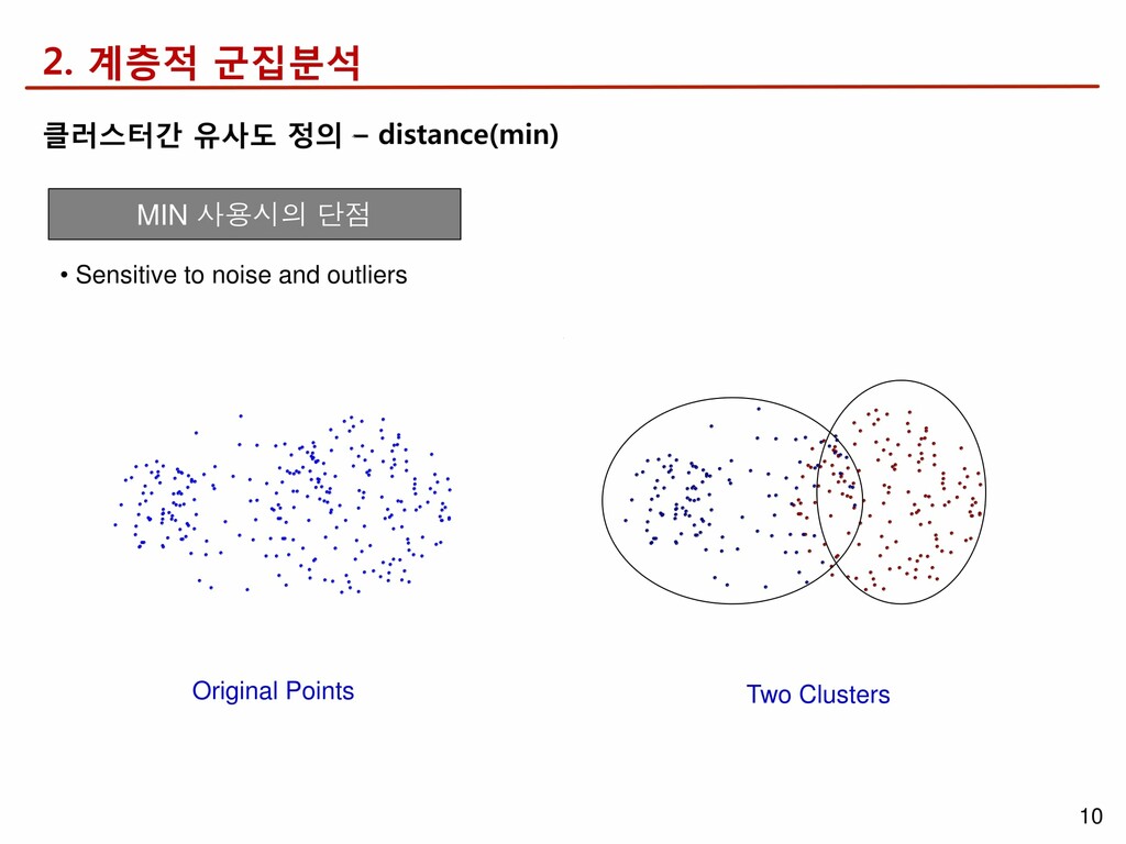 - 분할방법은 이와 반대 방향으로 작용하는데, 모든 레코드들을 포함하고 있는 하나의 군집에서 출발함