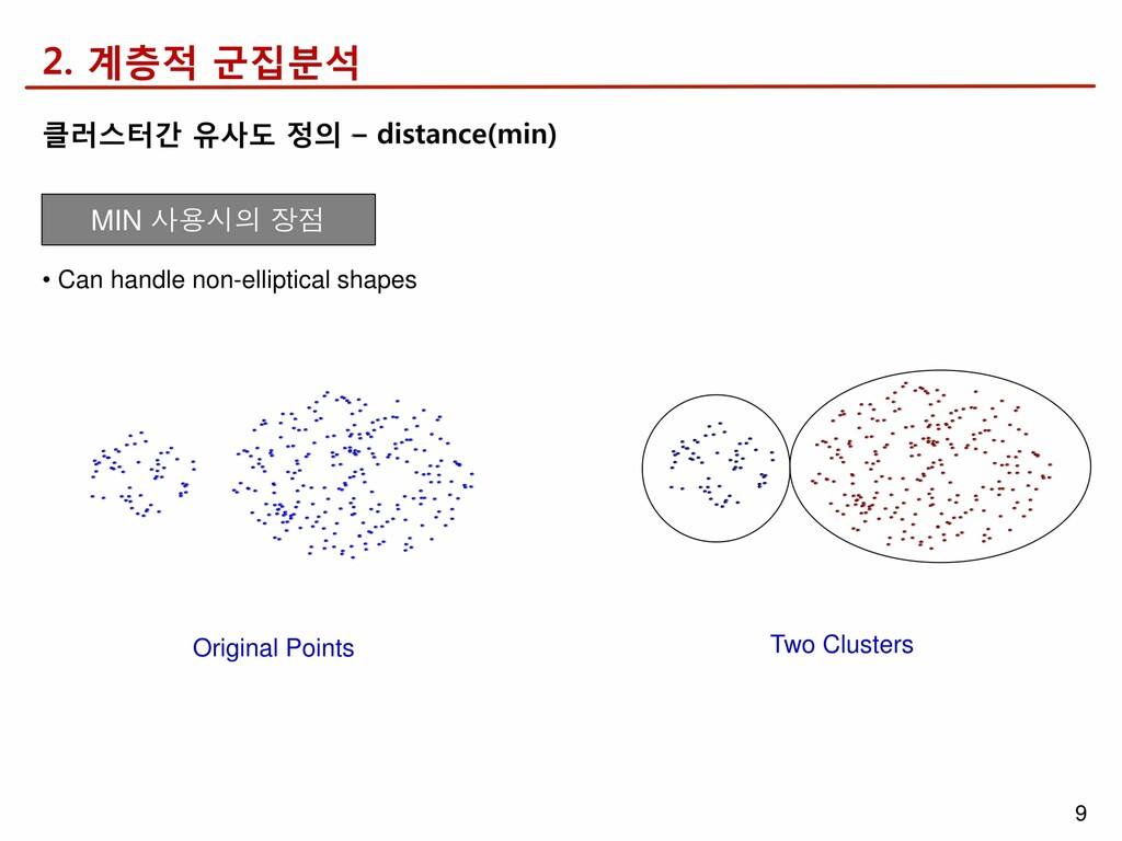 다양한 형태의 데이터에 적용가능 /초기 군집수의 결정에 민감