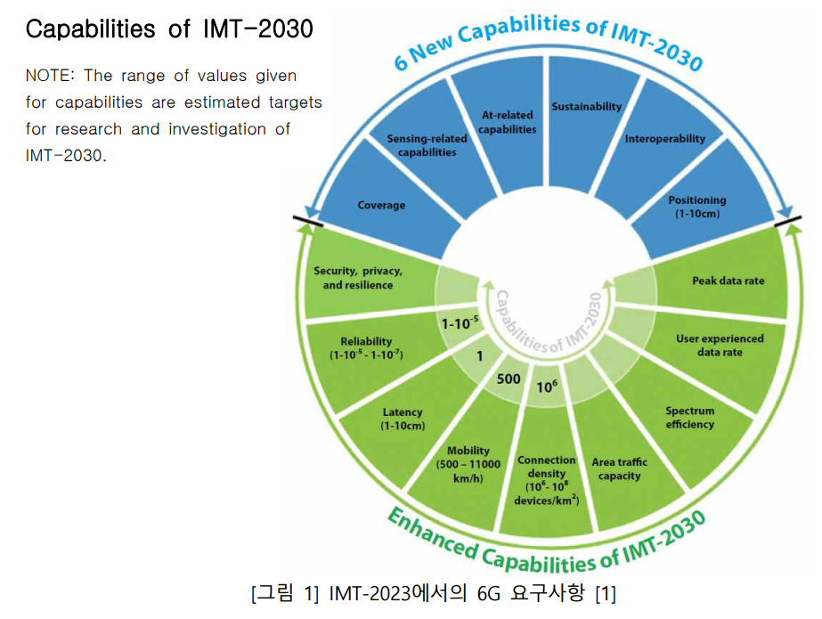 6G 기술로 지상 어디에서도 통신이 가능한 기술, 통신과 센싱 조합 기술, 무비용/무 전력 단말, 인공지능 무선접속 기술을 제시하고 있 다[10]. 현재 두 개의 이동통신 셀에서 동시에 데이 터를 송수신하는 이중접속 기술, 단말과 기지국간 액세스 구간과 기지국과 코어망간 백홀 구간 데이 터 송수신 요구에 동적으로 대응하는 통합 액세스 백홀 기술, 차량과의 통신기술 등이 개발되고 있으 며, 6G 기술로 지상에서의 통신을 넘어서, 드론 통 신, 위성 통신 등과 연계하여 공중을 포함한 지구상 어디에서도 통신이 되는 기술을 제시하고 있다. 또 한, 센싱에 활용이 용이한 0.3THz 대역 까지 활용 한 통신기술, 무선 원거리 충전 등을 통한 무비용/ 무전력 단말, 자기 학습 송수신에 기반한 인공지능 무선접속 기술을 6G 기술로 제시하였다.