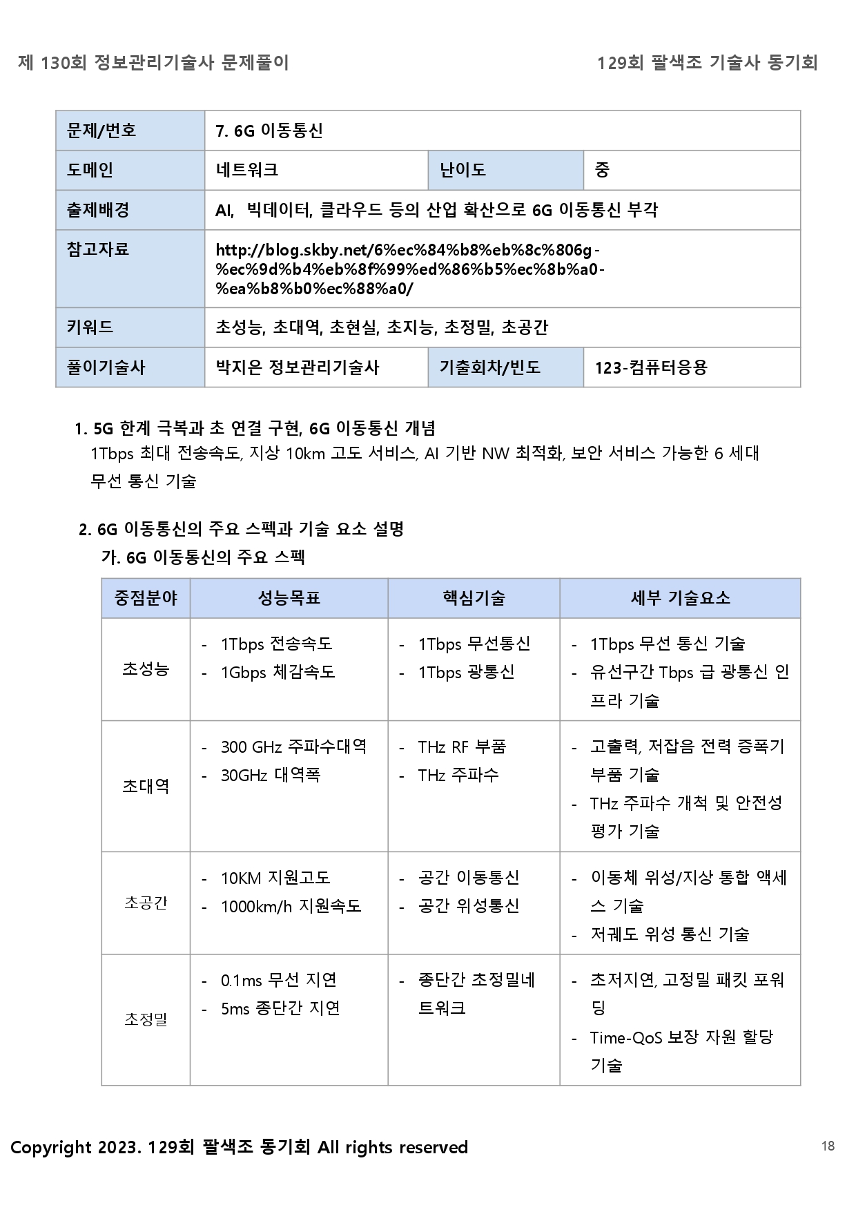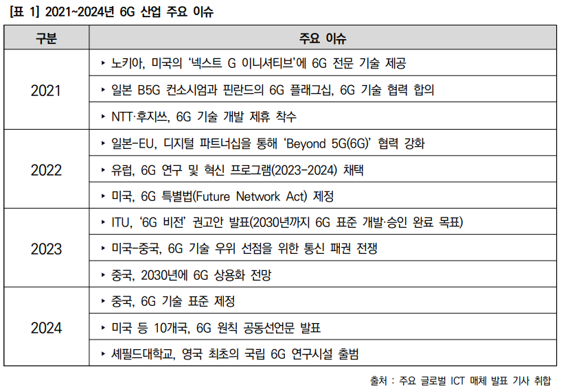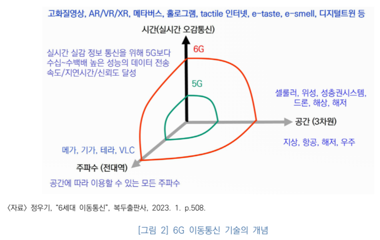 5G 한계를 극복하는 데 초점을 맞췄다. 5G는 무선구간에 대한 지연시간만 1ms로 단축했다. 유선구간을 포함한 네트워크 종단간의 지연시간(수십ms) 단축효과는 미미했다. 최대 20Gbps의 5G 전송속도로는 다수가 이용하는 자율주행, 초실감 증강현실(AR)·가상현실(VR) 등 초고속 융합서비스를 보편화하는 데 한계가 따른다. 인공지능(AI)은 네트워크 자원 관리 기능(코어 네트워크)에 부분적으로만 도입할 수 있다. 커버리지 또한 지상으로부터 최대 120m 높이까지 단말만을 지원하기 때문에드론, 플라잉카 등 향후 등장할 공중 비행체에 적용할 수 없다.