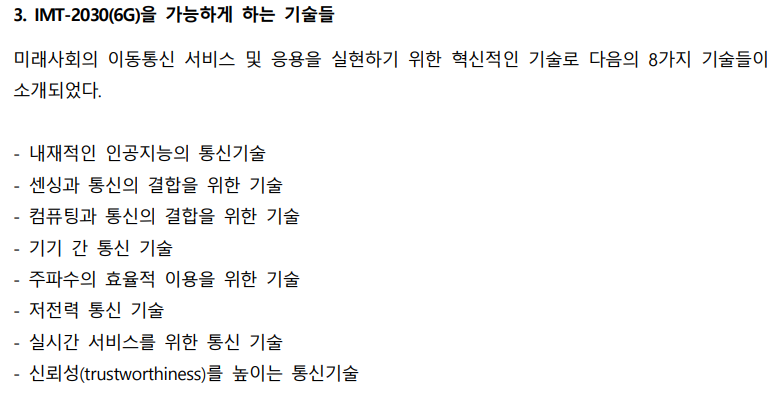 6G 이동통신 중 핵심 부분인 무선전송/접속 기술 관련해서는 테라헤르쯔 대역을 활용하기 위한 기술, 인공지능 적용 무선통신 기술, 위성 및 근거리 통신 과 접목 기술, 초정밀 측위 등 통신 활용 기술 등이 주요기술로 제시되고 있으며, 새로운 변복조, 채널 부호화, 다중안테나 기술 등으로 표준화되고 개발될 것으로 예상된다.