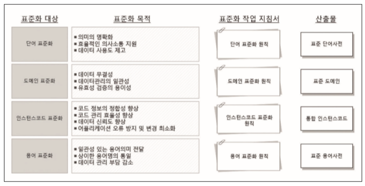 [개념] 표준화 수행 대상별 표준화 목적을 달성할 수 있도록 표준 원칙을 수립하고, 표준화 작업 수행 산출물과 각 표준화 원칙을 기준으로 데이터 모델을 위한 데이터 표준정의서를 작성