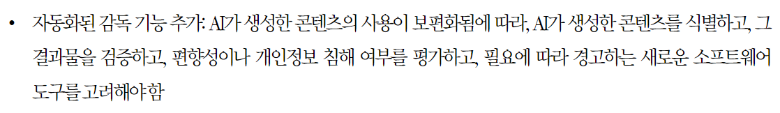: 사업자들- 인공지능 활용을 감독할 내부 거버넌스를 정립하는 기준개발자- 윤리중심의 설계(ethics by design)를 구현하는 방안 등이