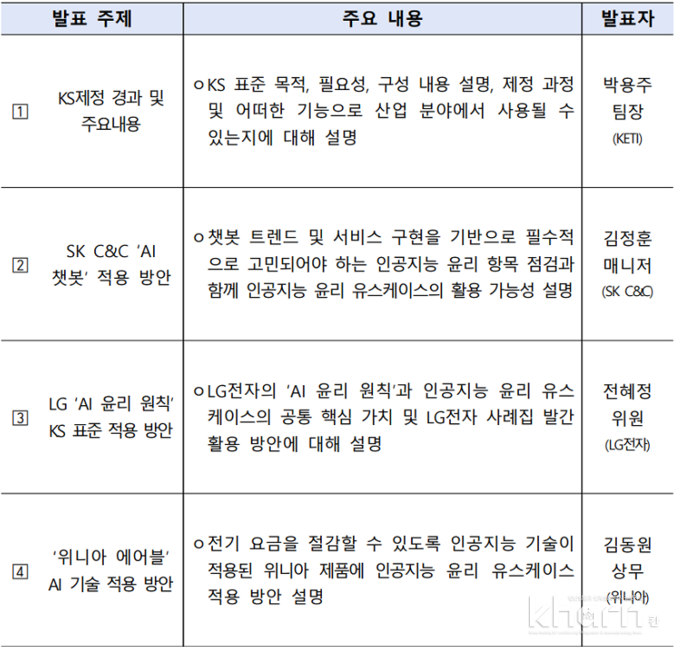 주제발표는 △KS 제정 경과 및 주요 내용 설명(전자기술연구원) 후 △‘AI 챗봇’ 적용 방안(SK C&C) △‘AI 윤리 원칙’ KS 표준 적용 방안(LG전자) △‘위니아 에어블’ AI 기술 적용 방안(위니아) 등 AI 윤리 점검서식 기업 적용방안 3사 발표에 이어 △향후 윤리 KS 개발내용 소개(전자기술연구원) 순으로 진행됐으며 실생활에서 활용도가 높은 챗봇·CCTV·교육서비스 등 표준 활용을 돕기 위한 10가지 사용사례가 공유됐다.