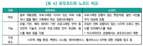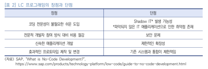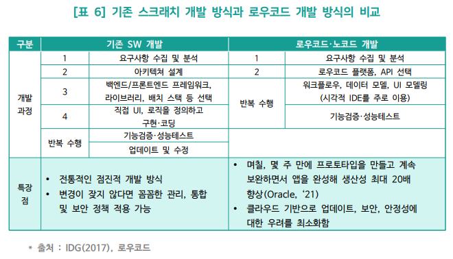 - 특히 맞춤형 기능이 필요한 경우나 특정 로우코드 도구에 의존하는 개발 언어의 사용은 개발자 풀을 제한하고 유지 보수를 어렵게 만듦.
