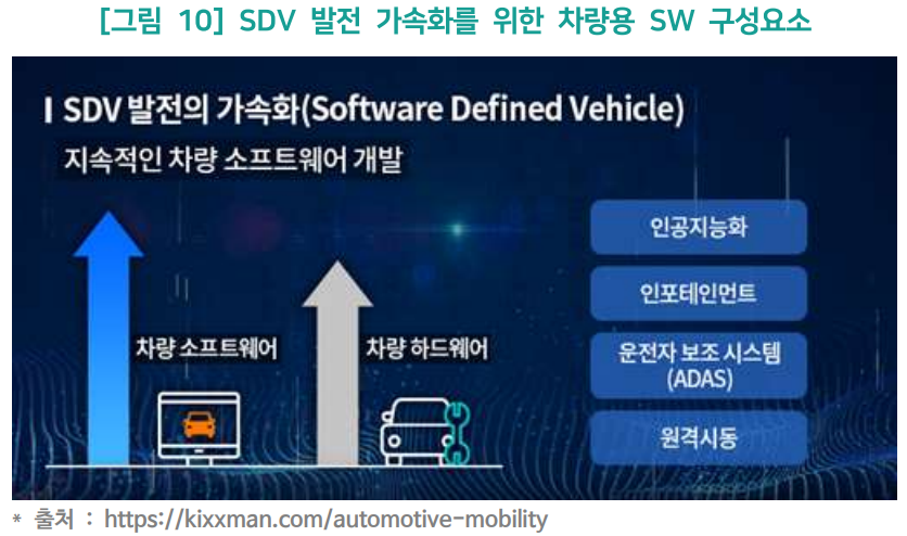 (정의) 소프트웨어가 하드웨어를 제어하고 관장하는 자동차로 과거의 자동차는 기계공학의 중심의 하드웨어가 주류였다면 SDV는 소프트웨어가 자동차의 주행 성능은 물론 안전 기능 심지어 차량의 감성 품질 등을 규정함