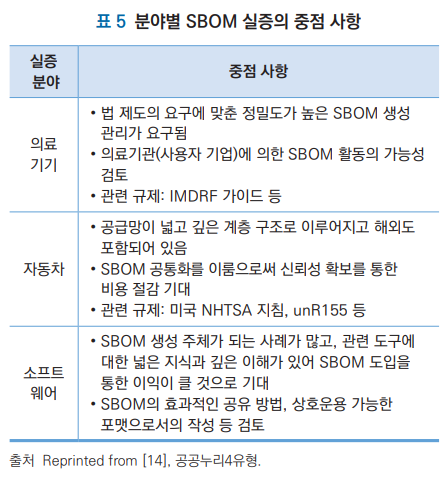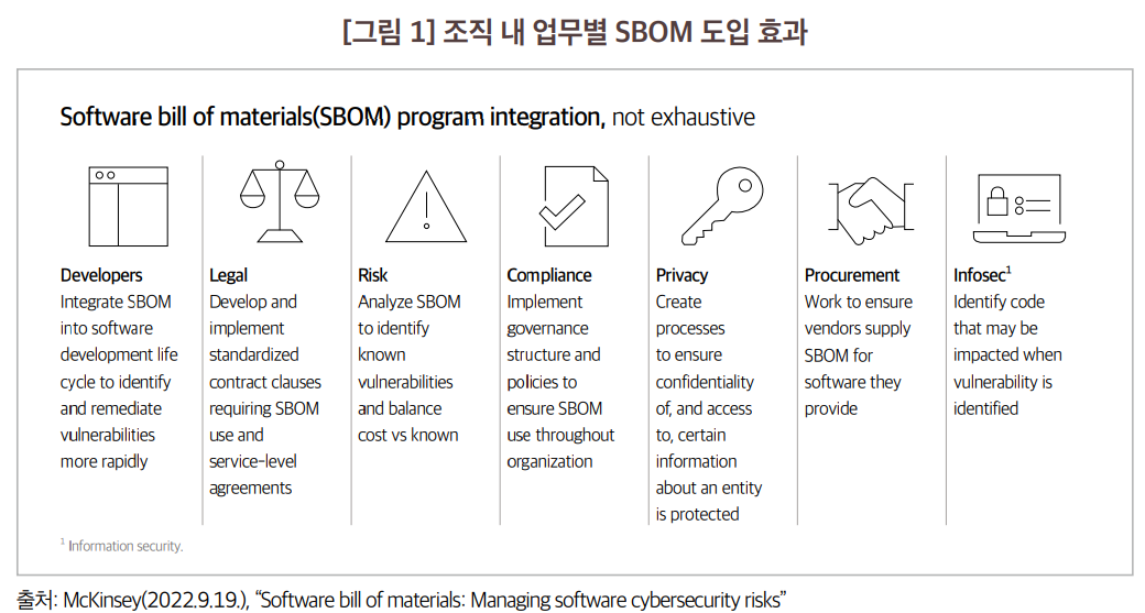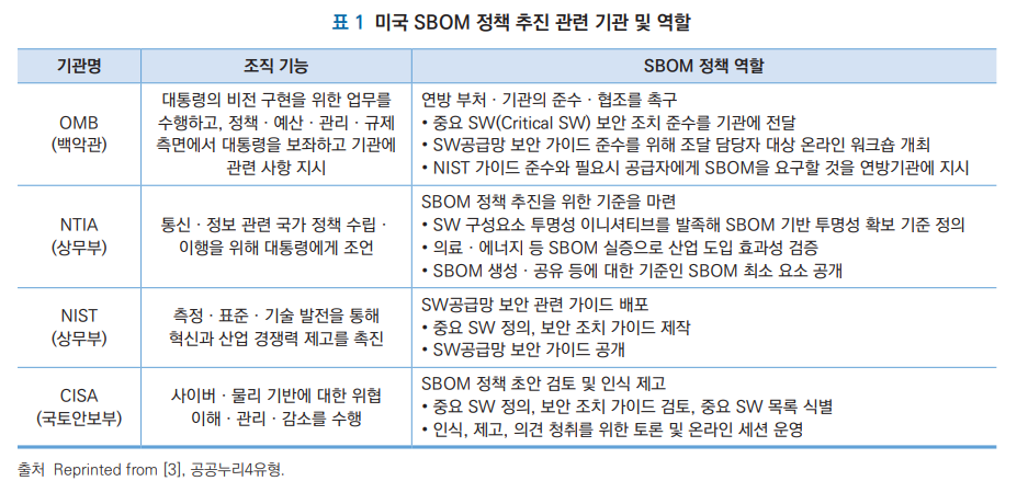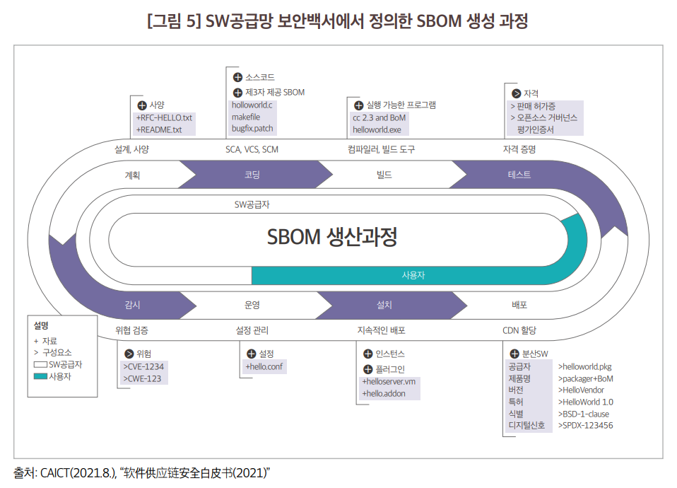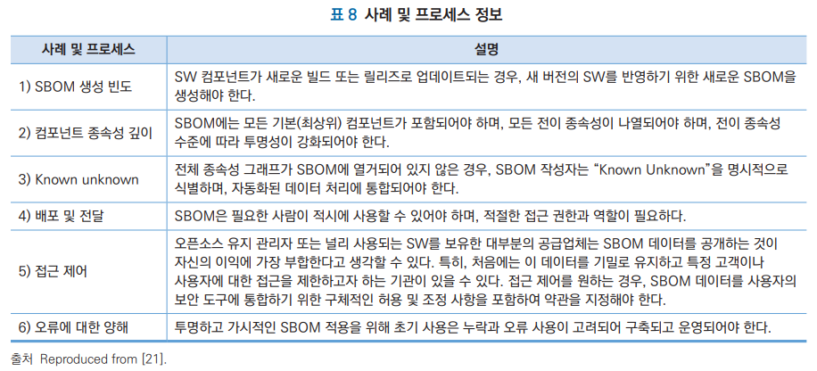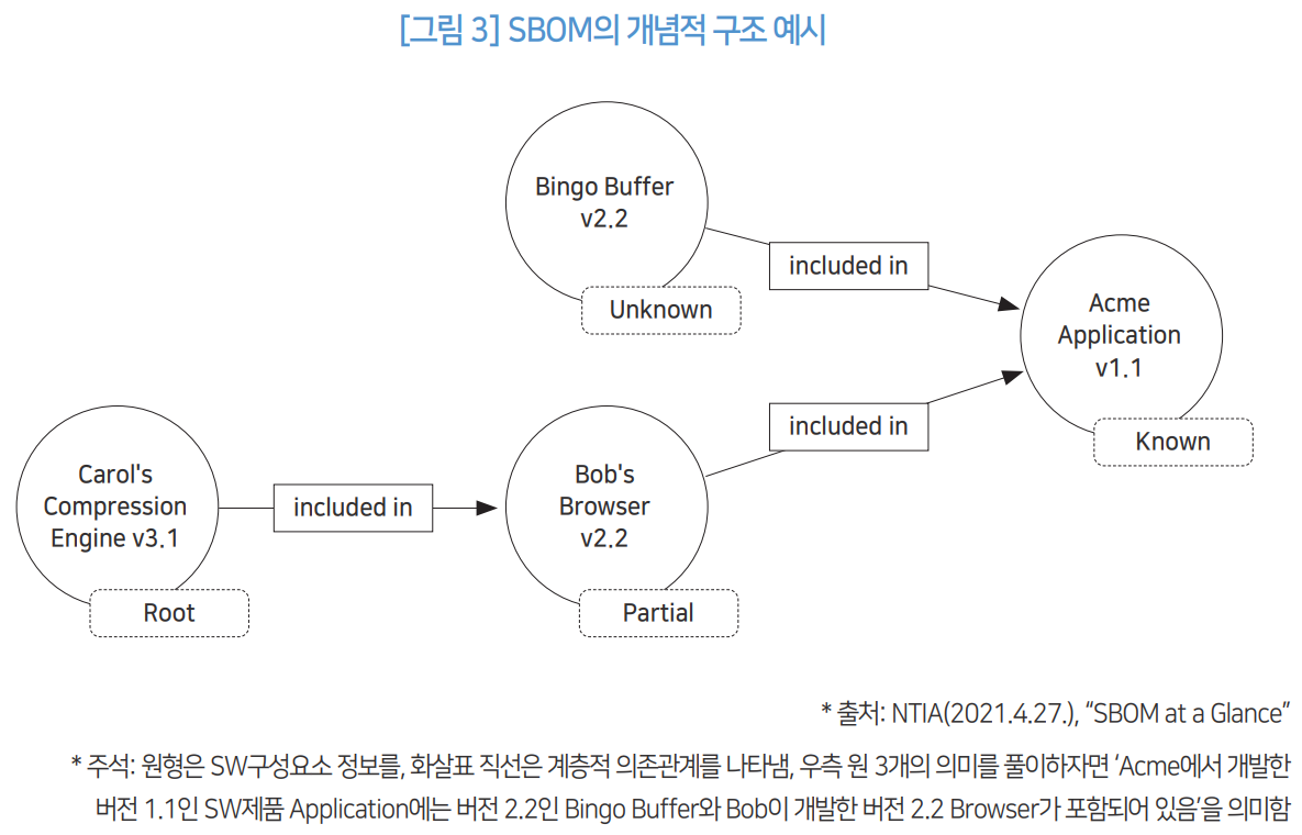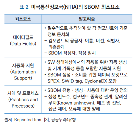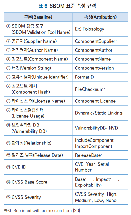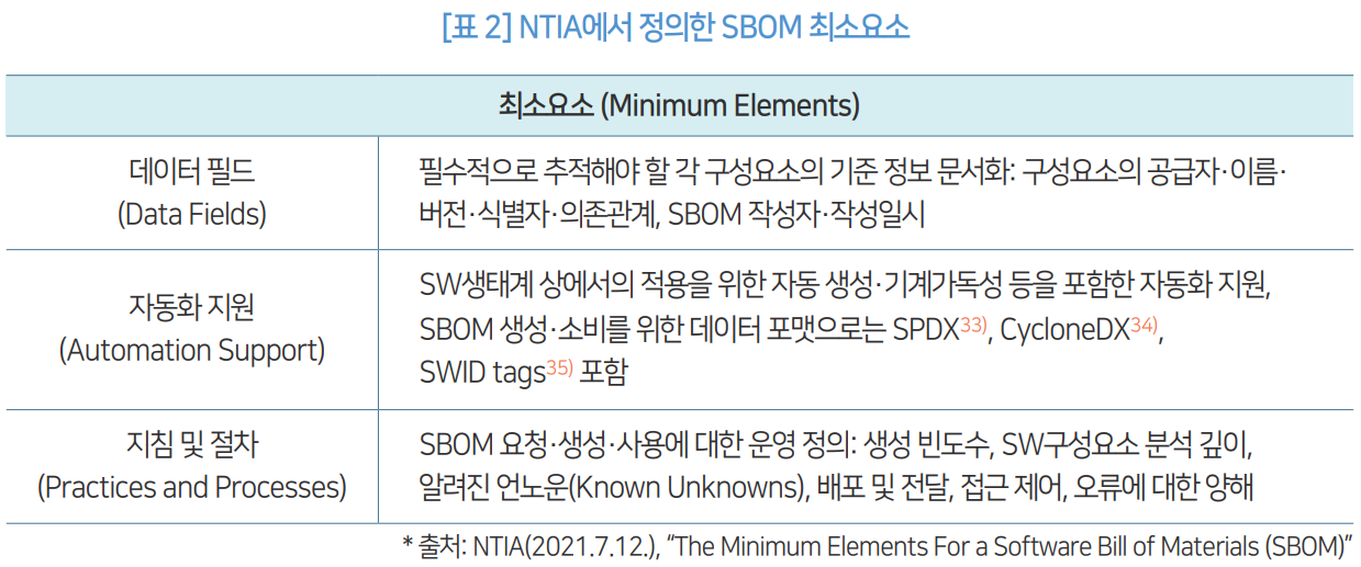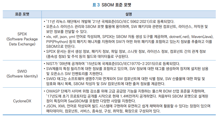 출처: 김선우, 손경호. (2022). OSS 추적성을 위한 SBOM 동향. 정보보호학회지, 32(5), 53-66.