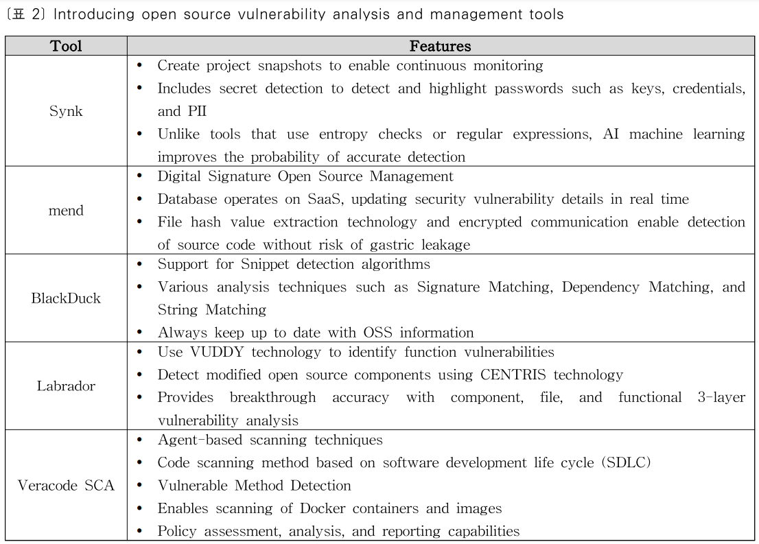 널리 사용되는 OSS 취약성 관리 도구로는 Synopsys의 Black Duck과 WhiteSource의 Mend가있다.