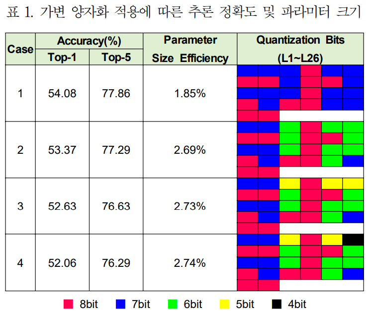 2)추론 정확도 감소의 영향이 적은 레이어는 더 적은 비트로 양자화하는 가변 양자화를 수행 하였다.