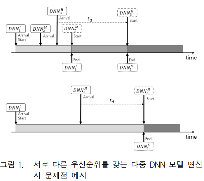 DNN 모델 1,2,3 은 각각 Low, Mid, High 의 우선순위를 가지며,