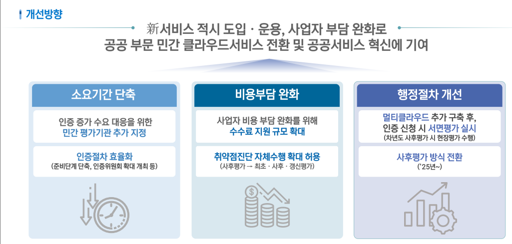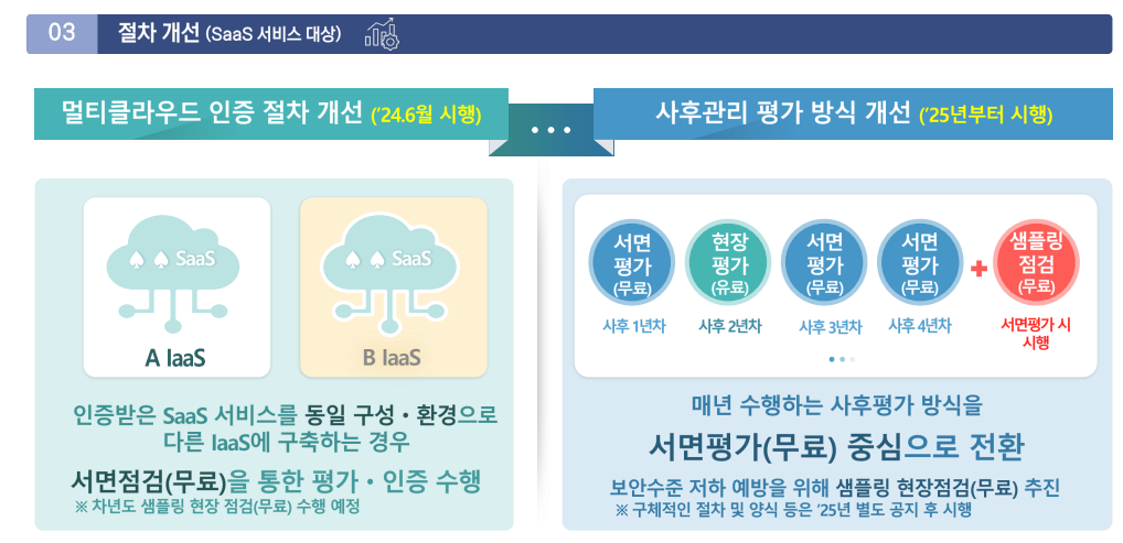 한편, 중등급 시스템은 행정 내부업무 운영 시스템도 중요도에 따라 중등급으로 분류할 수 있게 됨에 따라 보안성을 담보한 네트워크 접근을 허용하고 내‧외부망 접근‧활용 등에 대한 실증‧검증을 통해 세부 평가기준을 보완할 계획이다. 뿐만 아니라, 기존유형(IaaS, SaaS표준, SaaS간편)에 대해서도 업계 애로사항을 반영하여 상벌규정 등 불필요한 평가항목은 통폐합 및 삭제하였으며, 클라우드 멀티테넌트 특성(다중이용자 사용)을 고려하여 이용기관별 테이블 분리 기준을 완화하는 등 합리적으로 규제를 간소화하였다.