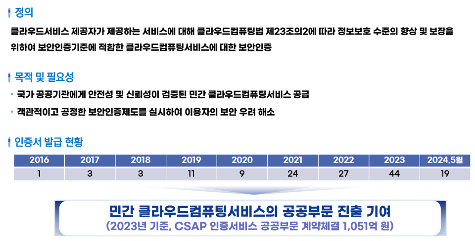 특히 여기서 주목할 것은 이제까지 공공시장 진출이 힘들었던 외국계 클라우드 서비스 제공사, 영어로는 ‘Cloud Service Provider’. 즉 CSP의 공공 진출이 가능해진다는 거죠. 그러니까 등급제로 바꾼 이유가 표면적으로는 기존 인증 제도가 너무 오래 걸린다. 너무 팍팍하다, 채워줘야 되는 게 많다, 이런 설명이었고요.
