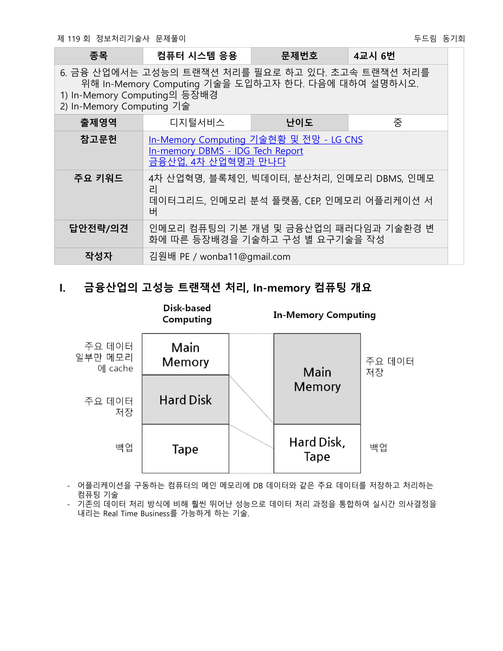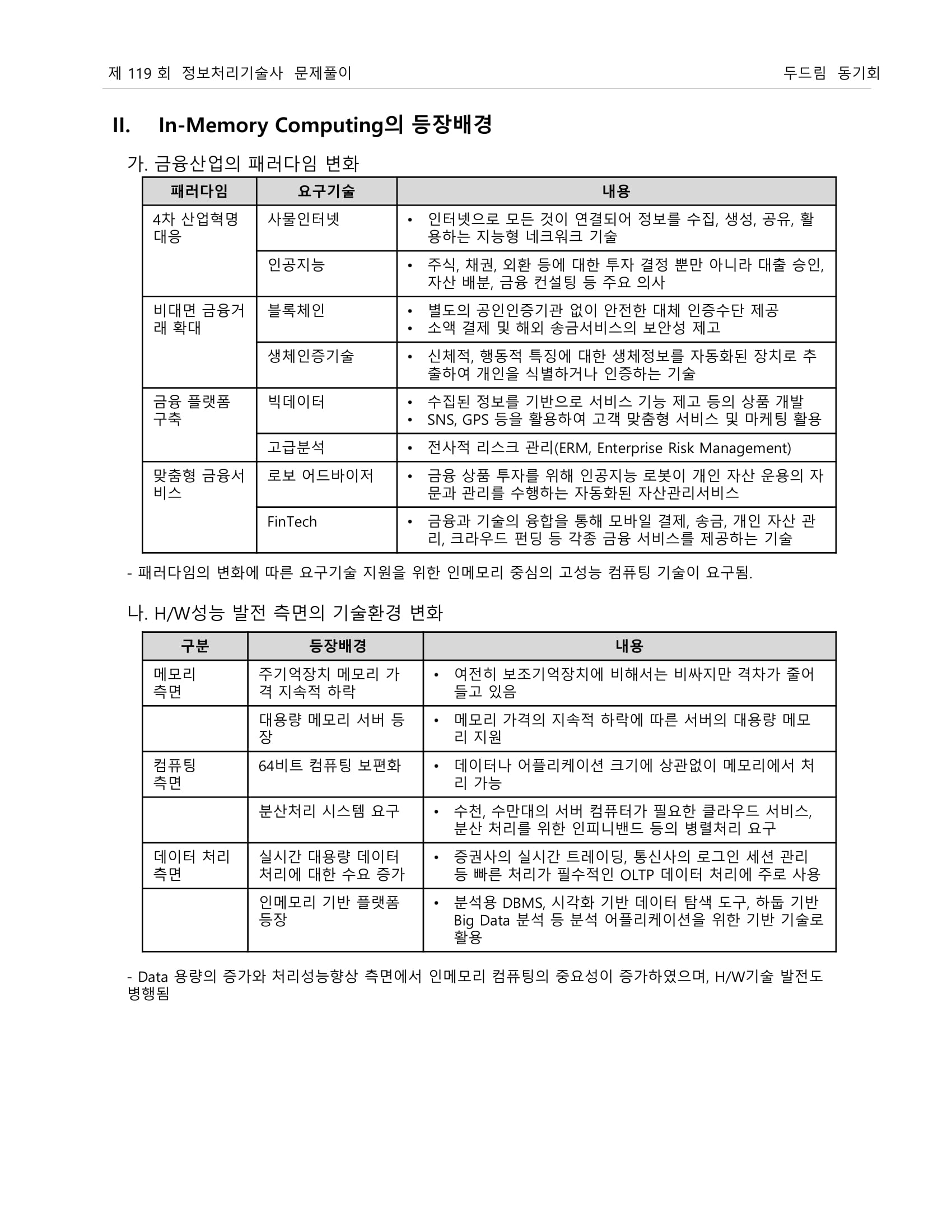 64비트 범용 서버의 활용 확산, 메모리 가격의 하락 등 하드웨어의 발전과 실시간성을 요구하는 응용 분야의 확대로 인하여 인-메모리 컴퓨팅 기술에 대한 관심이 높아지고 있습니다.