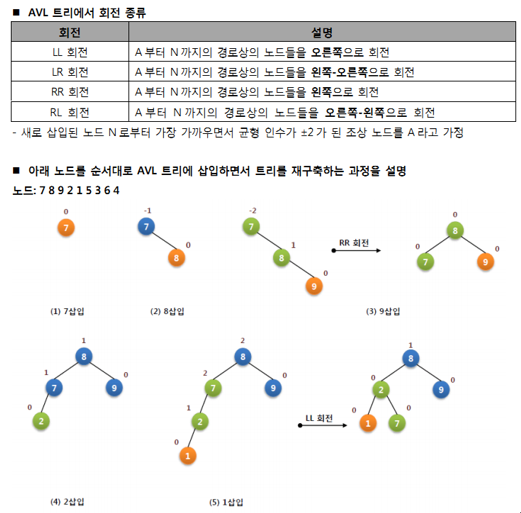 - 각각의 노드마다 균형치가 +-1 이하힌 height balancd Tree를 위해 균형치를 검사하여 회전연산을 시행하는 자료구조