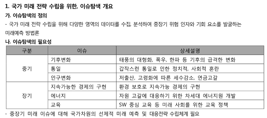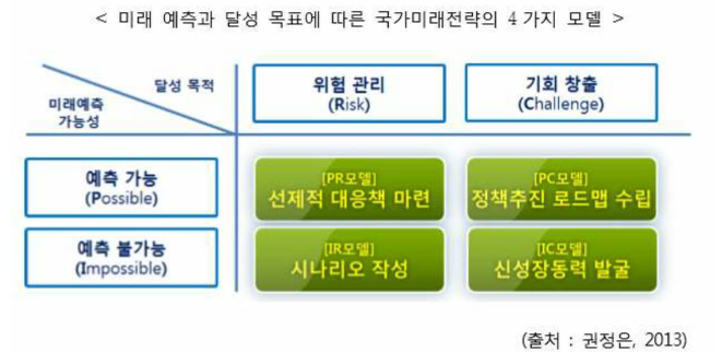 잠재적인 문제, 위협, 기회 그리고향후 개발 가능성에 대한 체계적인 조사를 통해 새로운 문제, 위크 시그널을 감지하고 분석하여 선제적 대응책을 정책구축, 지식 아젠다 발굴을 위한 도구로 활용