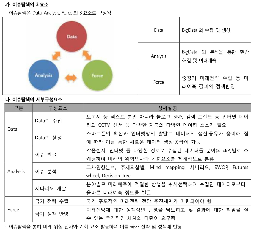 첫째, 데이터 수집 과정이다. 즉, 정치, 경제, 사회, 기술 또는 환경 속에서 다가오는 이슈에 대한 정보와 증거를 체계적으로 수집하는 과정을 의미한다.