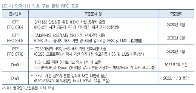 양자통신 분야에서 주도적 표준화 역할을 수행하기 위한 체계적 추진체계의 필요성에 따라, 2022년 12월 NIA·ETRI·KT·SKT·NSR 등이 참여하는 양자통신 프로젝트그룹(PG225)이 통신망 기술위원회(TC2) 산하에 신설되었다. 양자키 분배망의 공공기관 도입·운영 가이드가 TTA 고유 표준으로 2023년 12월 신규 제정되었다. 또 양자내성암호를 지원하는 전송망 프레임워크, 양자키 분배망 연동 시험 요구사항 등의 국내 표준화 활동을 하는 한편, ITU-T SG13, SG17, ETSI ISG QKD 등 국제표준화기구에서 제정된 국제표준안을 국내로 들여오는 준용 표준화 작업을 수행하고 있다.