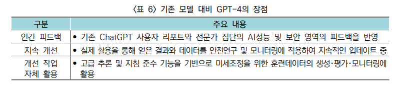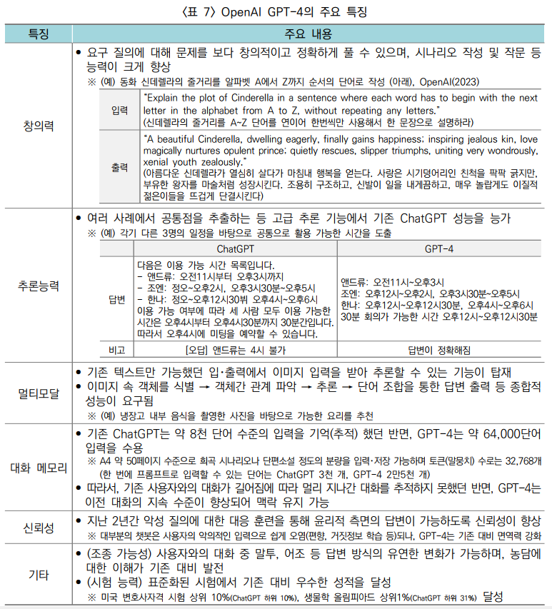 - 기존 챗GPT 대비 입력값의 다양화(음성, 이미지 등) 및 성능 향상이 있으나, 미흡한 추론 및 부정확한(최신 정보 결여) 답변 생성