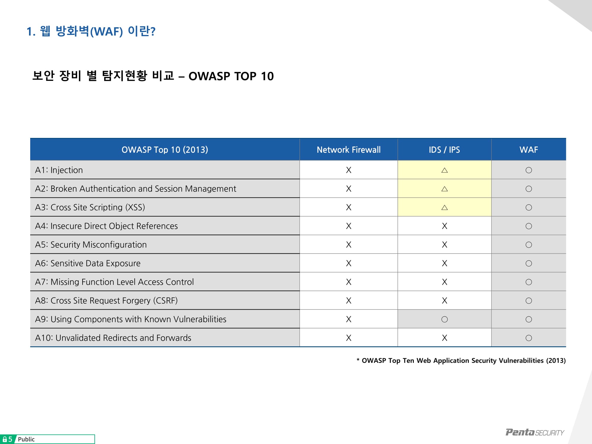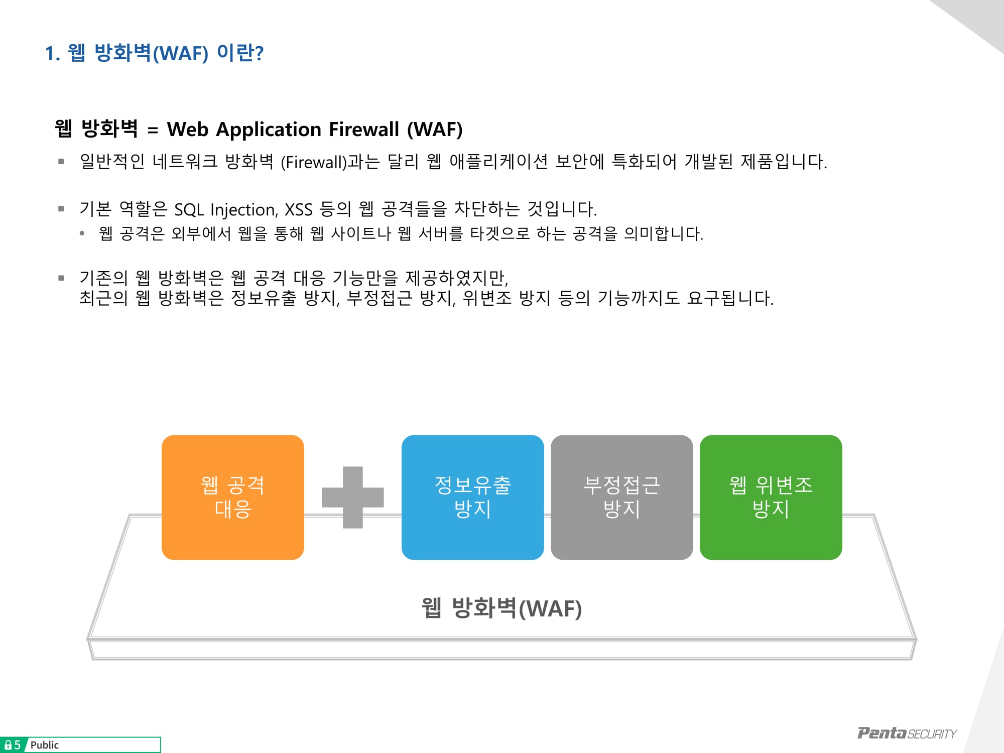 [개념] 애플리케이션 계층 분석 기술과 정규화 기술을 바탕으로 보다 특화된 검사 엔진을 탑재해 침입탐지시스템(IDS)나 침입 방지시스템(IPS)이 탐지할 수 없는 웹 관련 공격방어 기술 (SQL Injection, XSS)