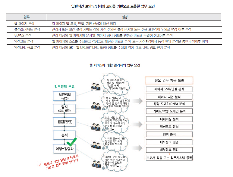 웹 서비스에 대한 관리자의 업무 요건을 정리하면 옆 그림과 같다. 보안 업계는 최근 웹 서비스 보안에 대한 이러한 이슈에 대 응하기 위해 많은 노력을 하고 있다. 그러나 관리해야 할 명확 한 URL에 대한 현황이 파악되지 않은 상황에서 방치돼 있는 수많은 하위 URL 정리 작업을 위한 사업이 진행되고 있다. 나 아가‘클린웹’이라는 이름의 안전한 웹 서비스 제공을 위한 인 프라 구축 사업도 추진하고 있다. 부족한 전담 인력 문제를 해 결하기 위해 웹 안전도 점검을 위한 업무를 명확히 정의하고, 해당 업무를 시스템화해 솔루션으로 구축하며, 상시 모니터링 까지 가능한 관제 업무에 적용하는 사례가 나타나고 있다. 이 미 사이버안전센터를 비롯해 일반 기업, 학교, 지방자치단체 등 사회 전분야로 확산되고 있다.