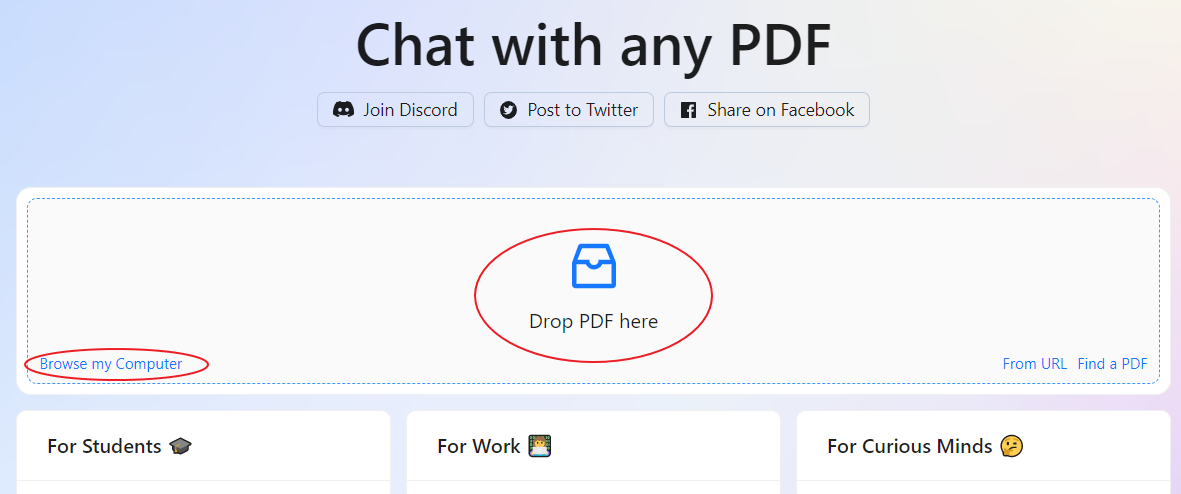 Drop PDF here 에 마우스로 해당 파일을 드래그&드랍하여 옮기거나, Browse my Computer, From URL, Find a PDF 메뉴를 통해 요약할 PDF를 추가한다.