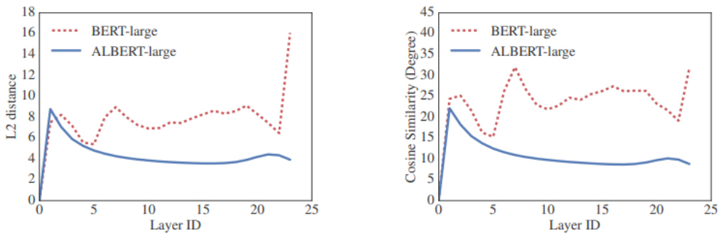 두 번째, cross-layer parameter sharing은 트랜스포머의 각 레이어에 포함된 학습 파라미터(multihead attention 및 FFNN 파라미터)를 모든 레이어에 동일하게 적용한 방법이다. 그림 4와 같이 각 레이어의 입력 벡터와 출력 벡터 사이의 L2 distance 및 cosine 유사도를 계산한 결과, parameter sharing을 사용한 경우가 그렇지 않은 경우보다 안정적(Smooth)인 변화를 보임을 확인하였다.