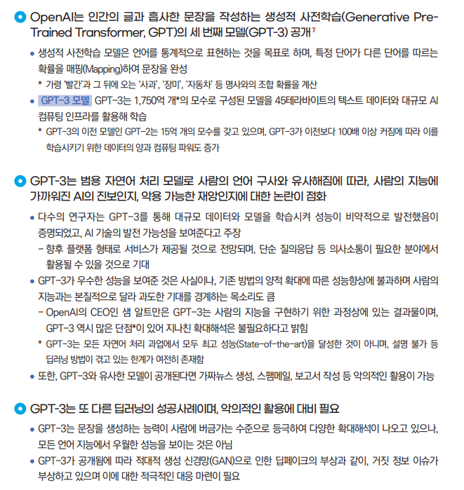 - 학습에 활용된 데이터(단어)는 크롤링(4,100억개), 웹텍스트(190억개), 책1(120 억개), 책2(550억개), 위키피디아(30억개)로 초대규모 데이터셋
