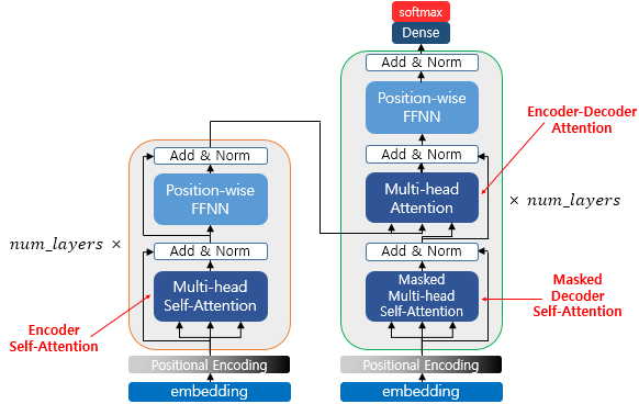 첫번째 그림인 셀프 어텐션은 인코더에서 이루어지지만, 두번째 그림인 셀프 어텐션과 세번째 그림인 인코더-디코더 어텐션은 디코더에서 이루어집니다. 셀프 어텐션은 본질적으로 Query, Key, Value가 동일한 경우를 말합니다. 반면, 세번째 그림 인코더-디코더 어텐션에서는 Query가 디코더의 벡터인 반면에 Key와 Value가 인코더의 벡터이므로 셀프 어텐션이라고 부르지 않습니다.