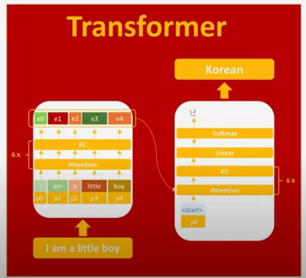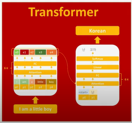 인코더로부터 정보를 전달받아 디코더가 출력 결과를 만들어내는 트랜스포머 구조를 보여줍니다. 디코더는 마치 기존의 seq2seq 구조처럼 시작 심볼 <sos>를 입력으로 받아 종료 심볼 <eos>가 나올 때까지 연산을 진행합니다. 이는 RNN은 사용되지 않지만 여전히 인코더-디코더의 구조는 유지되고 있음을 보여줍니다.