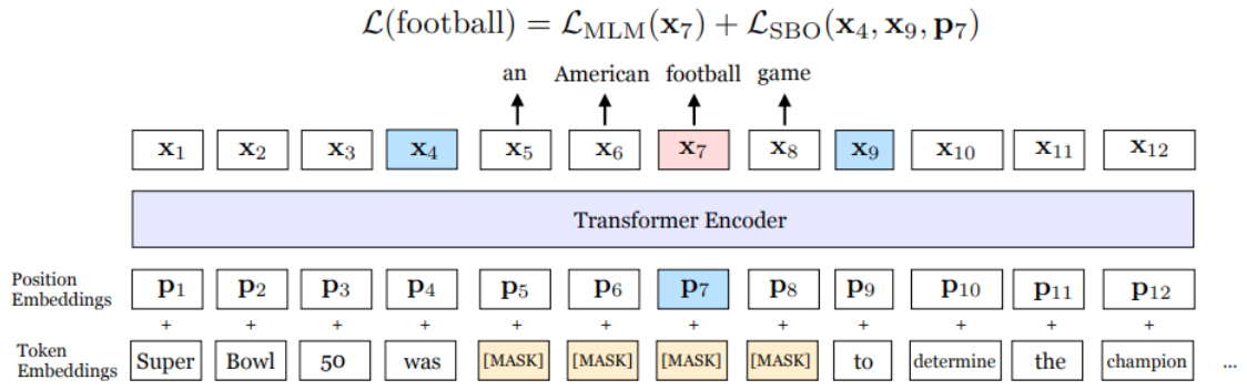 두 번째, Span Boundary Objective는 [MASK]로 변환된 단어의 원 단어 토큰을 추론할 때, 해당 단어의 출력 벡터로부터 추론하는 loss 외에 span의 경계에 위치한 단어의 출력 벡터로부터 해당 단어를 추론하는 loss를 추가하여 학습한 것이다. 그림 3을 살펴보면, 7번째 단어가 football일 때, x7 출력 토큰을 이용하여 football을 예측하는 loss와 span의 경계에 해당하는 x4 및 x9와 해당 단어의 위치인 p7을 이용하여 football을 예측하는 loss를 결합하여 사용한다.