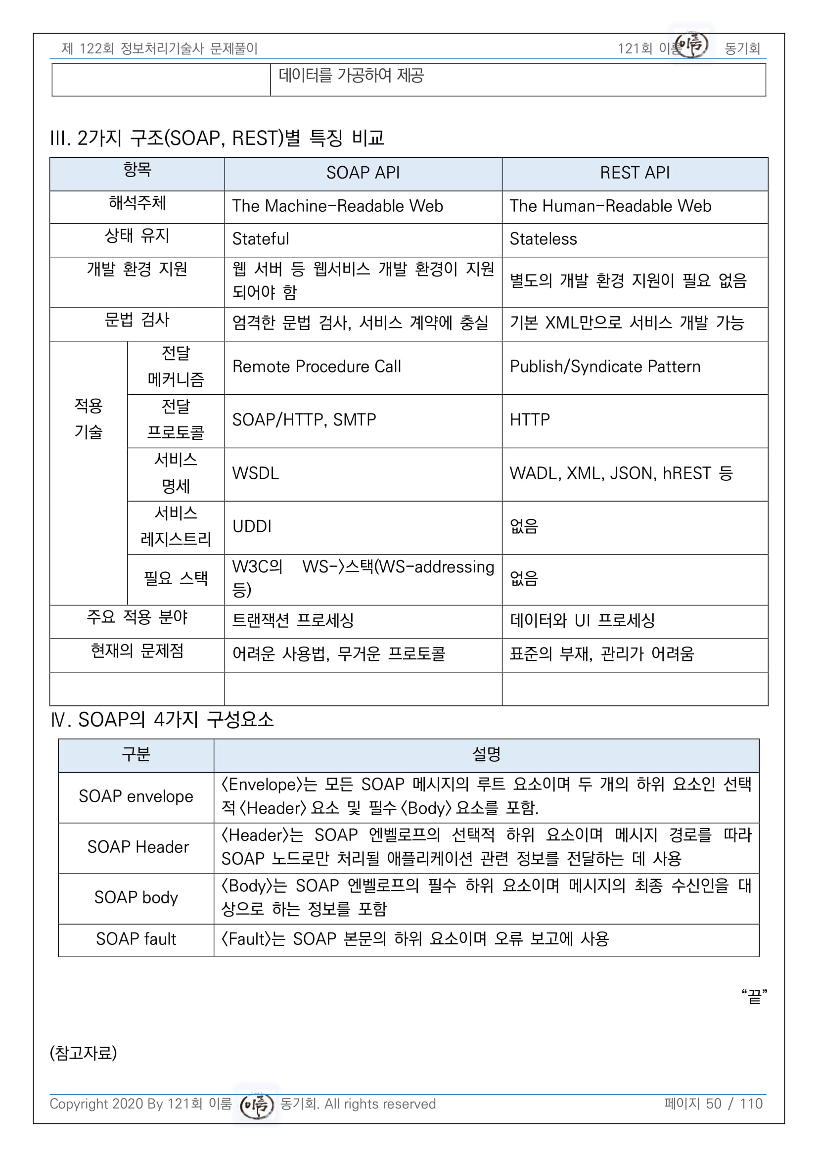 마지막으로 REST API는 정해진 명확한 표준이 없기 때문에 REST API를 사용함에 있어 '무엇이 옳고 그른지'가 아닌 개발하는 서비스의 특징과 개발 집단의 환경과 성향 등이 충분히 고려되어 설계되어야 할 것입니다.