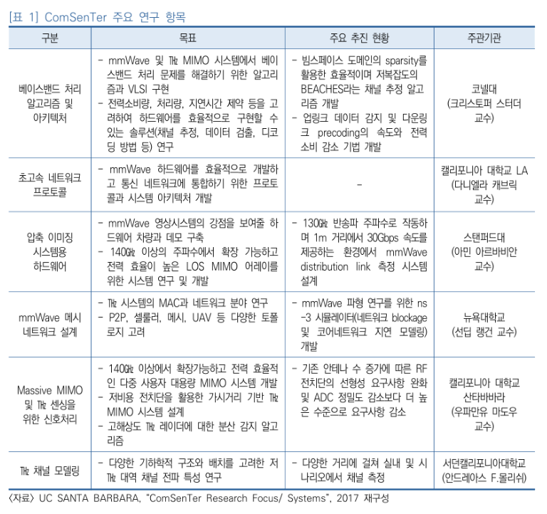 (ComSenTer 연구목적) 주로 100~1,000㎓ 대역 기반 무선통신시스템 용량 고도화와 고해상도를 지닌 소형 무선 영상시스템 개발