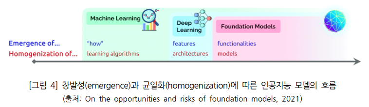 균일화: 모델이 점차 일반화된 지식을 도출해 낼 수 있게됨에 따라,하나의 뛰어난 모델이 적용될 수있는 범위가 점차 확대되며 더욱 보편적이고 범용적으로 활용되는 현상을의미