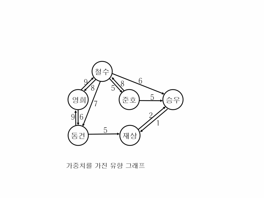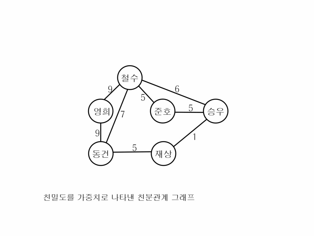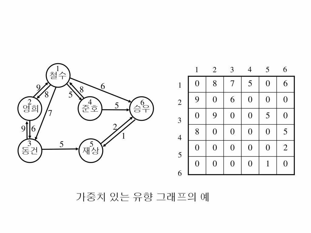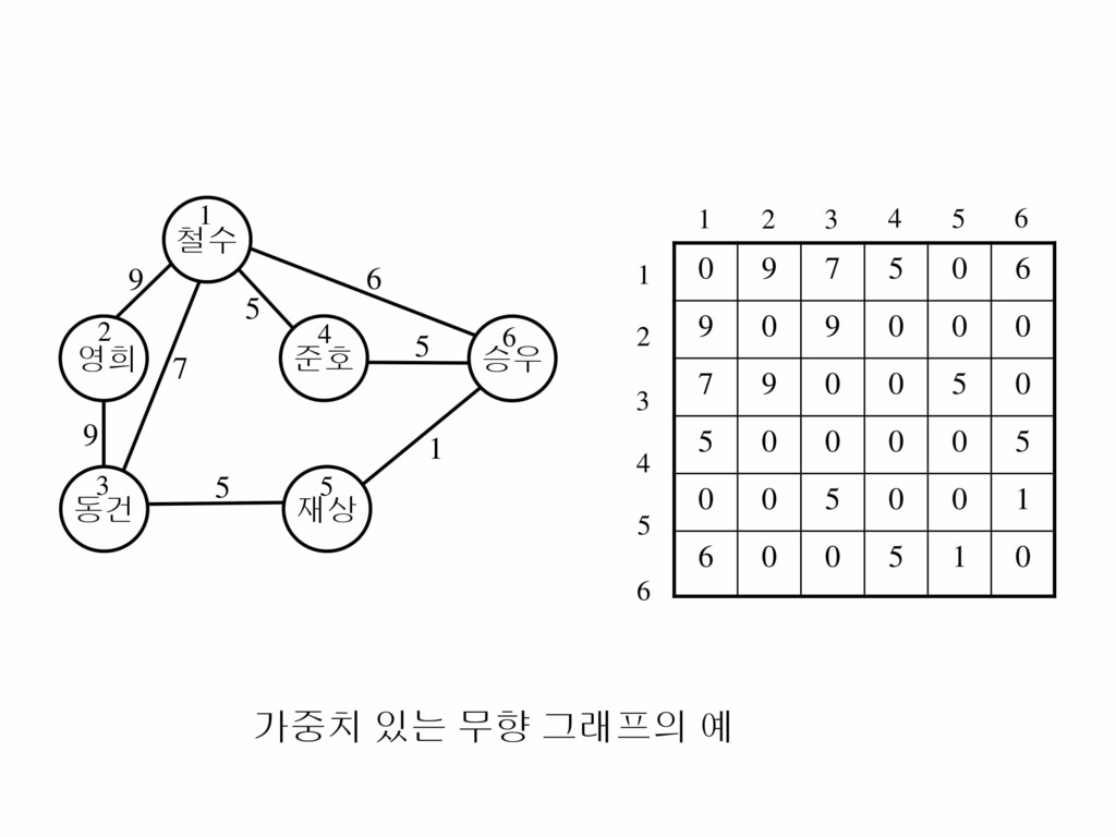 - 가중치 그래프(Weighted Graph), 네트워크 : 간선에 비용이나 가중치가 할당된 그래프