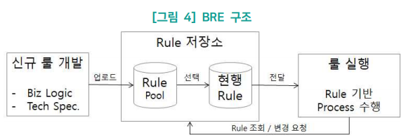 ㅇBRE는 비즈니스 프로세스 규정을 파일(DB)의 형태로 저장하며 규정이 변경 되어 해당 파일을 수정하면 코딩 없이 바로 비즈니스 프로세스가 변경됨